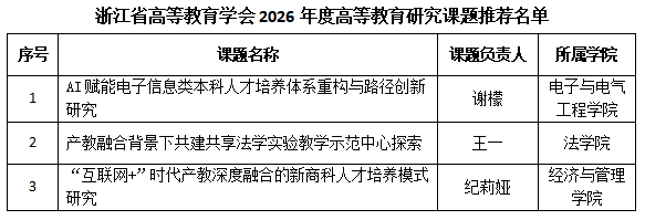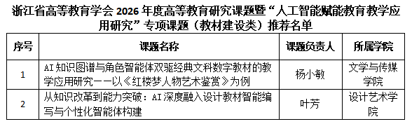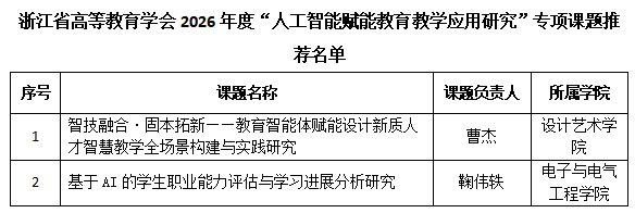 根据浙江省高等教育学会发布的《关于组织申报 2026年度高等教育研究课题暨“人工智能赋能教育教学应用研究”专项课题立项申报工作的通知》精神,经个人申报、学院审核、学校组织专家评审,同意推荐“AI赋能电子信息类本科人才培养体系重构与路径创新研究”等3项高等教育研究课题和“智技融合·固本拓新——教育智能体赋能设计新质人才智慧教学全场景构建与实践研究”等2项“人工智能赋能教育教学应用研究”专项课题申报省高等教育学会研究课题,同意推荐“AI知识图谱与角色智能体双驱经典文科数字教材的教学应用研究——以《红楼梦人物艺术鉴赏》为例”等2项高等教育研究课题申报省高等教育学会教材建设分会研究课题,现将结果予以公示,公示期为3天(2026年4月20日-4月23日),如有异议,请在公示期内与涂洁(浙政钉)联系。